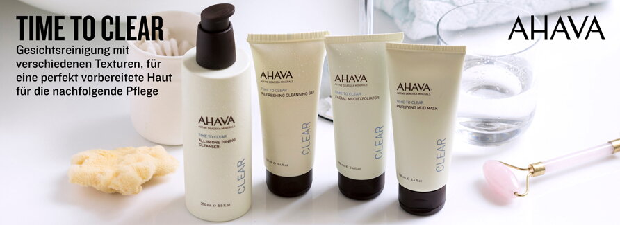 Um Ihrer Haut auf sanfte Art und Weise zu reinigen und zu pflegen, sind die Time To Clear Produkte von Ahava optimal geeignet. Sie befreien die Gesichtshaut von Schmutz und Verunreinigungen und verhindern so, dass die Poren verstopfen. Die Produkte bestehen aus natürlichen Zutaten, sodass sie nicht abgespült werden müssen und auch für Menschen mit empfindlicher Gesichtshaut gut geeignet ist. Damit für jede Situation der richtige Reiniger vorhanden ist, bietet Ahava verschiedene Produkte.