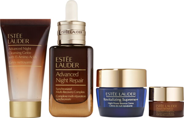 Verleihen Sie Ihrem Teint neue Ausstrahlung mit Formeln, die Linien und Fältchen sichtbar mildern und Ihren natürlichen Glow neu entfachen. Mit dabei: unser revolutionäres Advanced Night Repair Serum - das tiefenwirksam und schnell einziehende Gesichtspflege-Serum mit dem exklusiven Nacht-Peptid, das auf 40 Jahre bahnbrechender Nachtpflege-Forschung basiert. Advanced Night Cleansing Gelée entfernt sanft Make-up und Unreinheiten von der Hautoberfläche - ohne die Feuchtigkeitsbarriere zu beeinträchtigen. Die Haut fühlt sich weich, ausgeglichen und angenehm an. Mit der Zeit reduziert die Advanced Night Repair Eye Supercharged Gel-Creme sichtbar Linien, Fältchen, Schwellungen und dunkle Augenringe. Advanced Night Repair Serum verhilft der Haut zu einem glatteren, ebenmäßigeren und jugendlicheren Erscheinungsbild - für sichtbar mehr Strahlkraft und ein gesünderes Hautbild. Bei kontinuierlicher Anwendung verbessert Revitalizing Supreme+ Creme Moisturizer spürbar die Festigkeit und Elastizität der Haut - für ein strafferes, gefestigtes Hautgefühl. ZUSAMMEN GESTALTEN WIR DIE ZUKUNFT DER SCHÖNHEIT.
