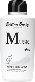 Bettina Barty Musk Hand- und Bodylotion enthält wertvolle Wirk- und Pflegestoffe und ist besonders auf die tägliche Hautpflege abgestimmt. Sie versorgt die Haut mit Feuchtigkeit und hält sie glatt und geschmeidig. Ein elegant-sinnlicher Duft, der die Haut umschmeichelt und die Sinne betört. Dermatologisch getestet.