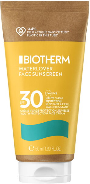 Die Biotherm Waterlover Face Sunscreen 50 ml SPF30 oder SPF50 Anti Aging Gesichtscreme bietet hohen Schutz für Gesicht, Hals und Dekolleté. UV-Strahlung verursacht 80% der Hautschäden. Die Anti-Aging Sonnencreme für das Gesicht von Biotherm, bietet einen optimalen Schutz gegen UV-Strahlen, um sonnenbedingter Hautalterung vorzubeugen: gegen Falten, Pigmentflecken und trockene Haut. Verpackt in nachhaltigem Design.