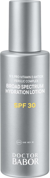 Hydratisierende, schnell einziehende Doctor Babor Broad Spectrum Hydration Lotion SPF30 mit Blue-Light- und Infrarot-Schutzkomplex. Antioxidative Ferulasäure, Ectoin und Provitamin D stärken die Hautbarriere und schützen vor oxidativem Stress. Beugt sonneninduzierter Hautalterung vor für sichtbar jugendliche Haut. Ergebnis: Sichtbar glatte, geschützte und intensiv hydratisierte Haut.