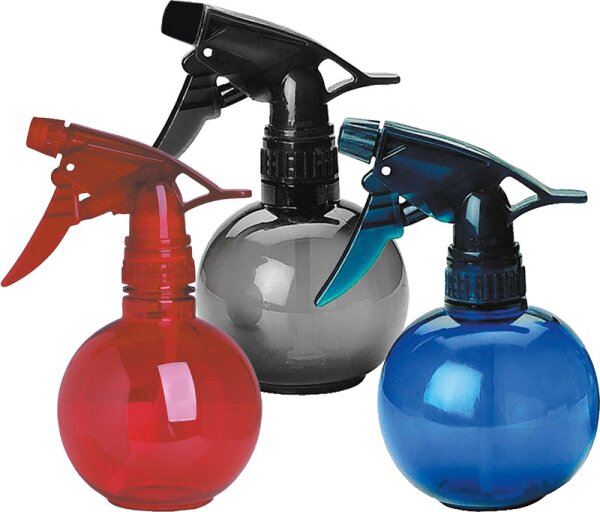 Die Efalock Sprühflasche ist in Kugelform gearbeitet und in 3 Farben erhältlich. Die transparente Flasche hat eine Höhe von 17,5 cm, besitzt ein Fassungsvermögen von 300 ml und ist mit einer robusten Sprühkopfmechanik ausgestattet.
