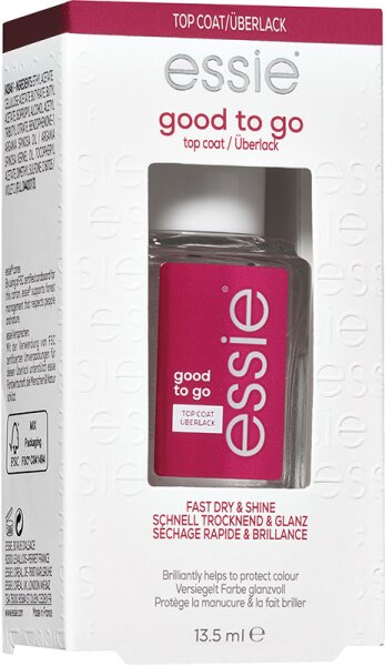 Der Essie top coat good to go ist ein extrem schnelltrocknender Überlack, der dafür sorgt, dass der Nagellack blitzschnell ausgehärtet ist. Damit ist die Maniküre in Sekundenschnelle erledigt und die Haltbarkeit des Nagellackes wird verlängert. Gleichzeitig werden die Nägel vor einem Absplittern geschützt. Die vegane Formel ohne Inhaltsstoffe tierischen Ursprungs hinterlässt ein hochglänzendes Finish und versiegelt die Farbe. Der Essie top coat good to go lässt sich über jedem Nagellack verwenden, um ihn widerstandsfähiger und robuster werden zu lassen. Der Fächerpinsel, der sich beim Auftragen der natürlichen Nagelform anpasst, lässt das Auftragen zu einem echten Kinderspiel werden.