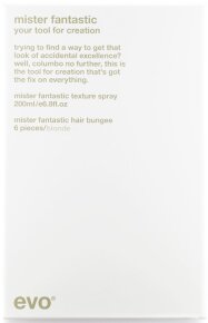 Das evo Hair Style Mister Fantastic Your Tool for Creation (blonde) ist ein Styling-Kit für kreative Köpfe. Es enthält ein Texturespray für endlos viele Stylingmöglichkeiten und 6 Stück Hairbungees. Damit ist es perfekt geeignet für das Stylen und Fixieren langer, dicker Haare, von Pferdeschwänzen, Dutts, lässigen Knoten, lockeren Hochsteckfrisuren, für Stylings mit sanfter Bewegung und Volumen sowie Wellen-Looks. Das evo Hair Style Mister Fantastic Your Tool for Creation ist auch für schwarzes und braunes Haar erhältlich.