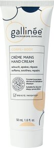Barriere-Reparatur dank der Gallinée Hand Cream mit leichter Textur: Die wunderbare Reparaturcreme für die Hände. Reparierend, nährend und dennoch nicht klebend oder fettend, repariert sie die Hautbarriere und hilft, das geschädigte Hautmikrobiom zu unterstützen. Probiotika, Präbiotika und Postbiotika schützen die Hände nach dem Waschen.