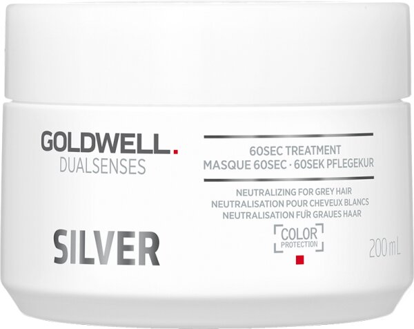 Das Goldwell Dualsenses Silver 60 Sek Treatment ist eine Pflege für graues Haar und kühle Blondtöne, verfeinert mit microPROtec complex und Luminescine. Regeneriert das Haar sofort bis zu 100% in 60 Sekunden. Neutralisiert unerwünschten Gelbstich und veredelt den kühlen Farbeffekt sofort. In das feuchte oder handtuchtrockene Haar einarbeiten und für 60 Sekunden einwirken lassen. Sorgfältig ausspülen.