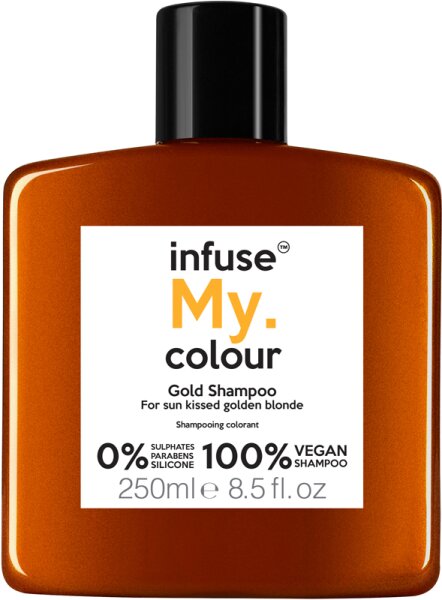 Das infuse My. colour Gold 250 ml ist ein 100% PETA zertifiziertes, veganes Shampoo, welches mit Farbpigmenten angereichert ist. Das Shampoo ist frei von Parabenen, Silikonen und Sulfaten. Es ist ein kühler Goldton, der allen warmen Farben und Highlights subtile Wärme verleiht. Gold eignet sich hervorragend um dunkelbraun gefärbtem Haar einen warmen, subtilen Goldschimmer zu verleihen. Verwenden Sie Gold auf gebleichten Blondtönen, um auffälliges Rosa zu erzeugen.