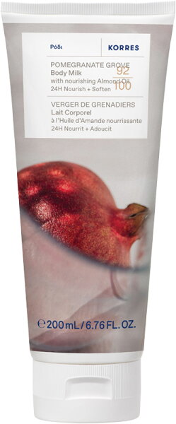 Seidig-zarte KORRES Pomegranate Grove Körpermilch, angereichert mit pflegendem griechischem Mandelöl, Aloe und Provitamin B5, die die Geschmeidigkeit der Haut verbessert und 24 Stunden lang Feuchtigkeit spendet. Duft: Fruchtiges und spritziges Aroma saftiger Granatäpfel mit frischen Unternoten knackiger roter Früchte.