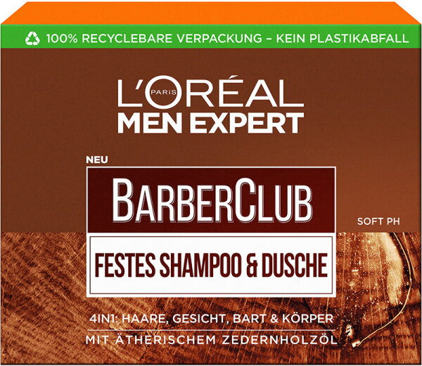 Vom Barber Club Festes Shampoo von L'Oréal Paris Men Expert profitiert der gesamte Männerkörper. Das feste Shampoo im typischen Seifenformat eignet sich für Haar, Gesicht, Bart sowie Körper. Es reinigt und pflegt dabei intensiv dank seiner Formel mit organischem und ätherischem Zedernholzöl. Zudem bietet das Solid Shampoo einen niedrigen pH-Wert, was es besonders sanft macht und für alle Hauttypen geeignet. Langanhaltende Feuchtigkeit spendet es selbstverständlich auch. Doch das Barber Club Festes Shampoo ist nicht nur gut zu Haut und Haaren, sondern auch zur Umwelt. Das XL-Format verspricht eine lange Nutzung und die plastikfreie Verpackung ist zu 100 % recycelbar.