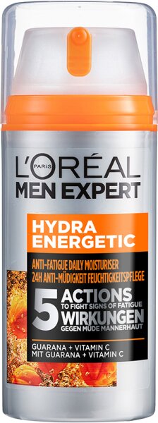 Die Hydra Energy 24H Feuchtigkeitspflege bekämpft 5 Zeichen müder Männerhaut - den ganzen Tag lang: Sie mildert Augenringe, hydratisiert, belebt und festigt die Haut. Das Hautbild wird nachhaltig verbessert und gleichzeitig mit Energie aufgeladen. Das Active Defense System™ - ein leistungsfähiger Aktiv-Wirkstoffkomplex - sorgt dafür, dass die natürliche Widerstandskraft der Haut gestärkt wird. Dank ihrer verbesserten Formel - mit dem natürlichen Wirkstoff Guarana und Vitamin C - liefert die Hydra Energy Gesichtspflege der Haut die Energie, die sie für ein strahlendes Aussehen und einen langanhaltenden Anti-Müdigkeits-Effekt braucht.