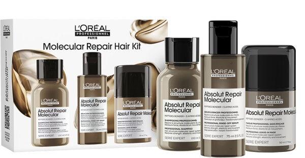 Das L'Oréal Professionnel Serie Expert Absolut Repair Molecular Trio Set wurde speziell für geschädigtes Haar entwickelt. Es repariert 2 Jahre Haarschäden in nur einer Anwendung.** Angereichert mit Peptidbondern & 5 Aminosäuren, dringt es tief in die Haarstruktur ein und verwandelt das Haar sofort. Das Shampoo reinigt das Haar und bietet intensive Pflege. Das Serum sorgt für eine molekulare Reparatur***. Das Leave-In macht das Haar glänzender & geschmeidiger. Hitzeschutz bis 230°C****. *Instrumenteller Test nach 15 Anwendungen des Rinse-Off-Serums. **Instrumenteller Test: nach Anwendung des Absolut Repair Molecular Trios. ***Instrumenteller Test: nach 15 Anwendungen des Absolut Repair Molecular Rinse-Off Serums. ****Instrumenteller Test.