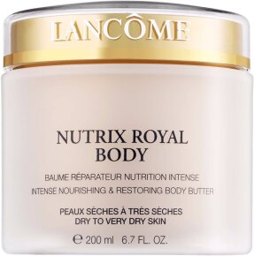 Die Lancôme Nutrix Royal Body Crème 200 ml ist eine zartschmelzende Creme und ein wahrer Balsam für den Körper. Sie pflegt selbst besonders trockene Haut wieder sanft und geschmeidig. Die Nutrix Royal Body Crème regt die natürliche Lipidproduktion der Haut an und pflegt sie geschmeidig zart. Die hauteigene Schutzbarriere wird gestärkt, sie wird widerstandsfähiger und die Haut ist so vor äußeren Einflüssen geschützt. Fünf besonders reichhaltige Öle pflegen intensiv und schenken Wohlbefinden.