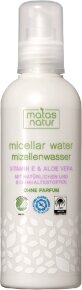 Matas Natur mizellenwasser ohne Parfum. Der milde All-in-One Gesichtsreiniger befreit Gesicht und Augenpartie gründlich von Make-up und Verunreinigungen. Vitamin B3 reduziert die Sebumproduktion und klärt Unreinheiten. Allantoin beruhigt, Bio-Aloe Vera hydratisiert und antioxidativ wirksames Vitamin E schützt die Haut. Als zusätzliche Feuchtigkeitsspender enthält das Mizellenwasser Glycerin und Betain.