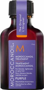 Das Moroccanoil Treatment Purple ist ein hochwertiges Haarpflegeöl, das speziell entwickelt wurde, um unerwünschten Gelbstich in blondem, aufgehelltem oder grauem Haar zu neutralisieren. Die einzigartige Formel enthält violette Pigmente, die den Gelbstich wirksam ausgleichen. Angereichert mit nährendem Arganöl und Leinsamenextrakt, verbessert das Öl die Kämmbarkeit, verleiht dem Haar intensiven Glanz und pflegt die Farbe. In einer Verbraucherumfrage nach einer einwöchigen Anwendung bestätigten 95% der Teilnehmer, dass das Produkt den Gelbstich sichtbar reduziert, während 91% es als unverzichtbar für die Pflege ihres blonden Haars ansehen*.