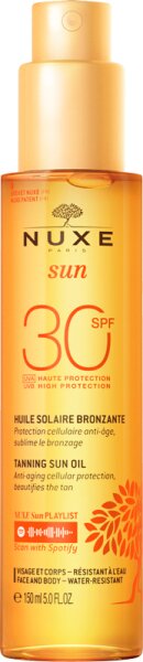 Das Nuxe Sun Huile Bronzante Visage et Corps ist ein Sonnenöl für Gesicht und Körper. Es gewährleistet einen Anti-Aging-Zellschutz, ohne auf perfekte Bräune verzichten zu müssen. Die alkoholfreie Textur zieht schnell ein, nährt die Haut und zaubert auf ihr einen zarten Satin-Effekt. Begleitet wird der perfekte Sonnenschutz von einem sonnigen Duft aus Süßorangen, Tiaréblüten und Vanille.