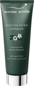 Die Swiss Smile Herbal Bliss Zahnpasta ist eine vitalisierende Kräuterzahnpasta. Kräuterkraft pur: hochwertiges Edelweiß gepaart mit Echinacea- und Grüntee-Extrakten sowie Chlorophyll. Die ausgewogene und wertvolle Formulierung der vitalisierenden Zahnpasta kräftigt sensible Zähne und beruhigt irritiertes Zahnfleisch. Durch die entzündungshemmenden Eigenschaften von Edelweiß-, Echinacea- und Grüntee-Extrakten wird das bakterielle Gleichgewicht wiederhergestellt, gereiztes Zahnfleisch regeneriert und revitalisiert. Zudem ist Edelweiß reich an natürlichen Flavonoiden, die durch ihre antioxidative Wirkung schädliche freie Radikale neutralisieren. Chlorophyll beseitigt zuverlässig unangenehme Gerüche und unterstützt zusammen mit dem natürlichen Minzgeschmack einen langanhaltenden, frischen Atem. Die auserlesene Wirkstoffkombination enthält 0% SLS und ermöglicht eine sanfte, schonende Zahnpflege, schützt vor Karies, hat eine entzündungshemmende Wirkung für kräftiges, gesundes Zahnfleisch und verhilft nachhaltig zu einer gesunden Mundflora.